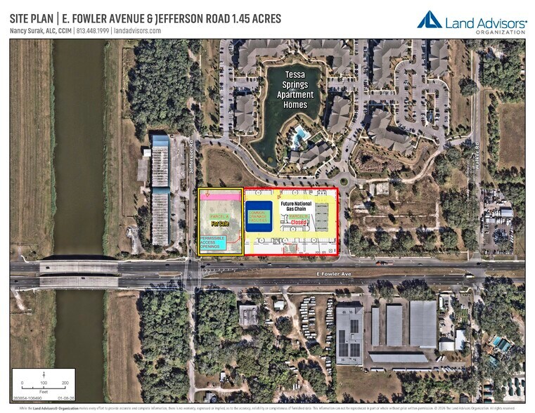 Located less than ¼ a mile from the Interstate 75 interchange and approximately 3.5 miles from the University of South Florida at the NE corner of East Fowler Avenue and Jefferson Road, property has 205 feet of highway frontage on East Fowler Avenue and 307 feet of frontage on Jefferson Road. It is wrapped on the northeast side by a 292 multifamily apartment development project known as Tessa Springs and is immediately adjacent to a future "National Gas Chain/C-Store". National Gas Chain/C-store is expected to start construction second half of 2026 and will be providing common area drainage and access. The property is subject to Declaration of Reciprocal Easements, Conditions and Use Restrictions Agreements that prohibit several uses including, fuel/c-stores and specifically "Dutch Bros". Other coffee and QSR uses are allowed. Additional restrictions include but not limited to, warehousing, dry cleaning plant, adult bookstores, drug rehabilitation facilities, funeral homes, bail bond businesses, night clubs, and obnoxious odors and/or loud noise uses.