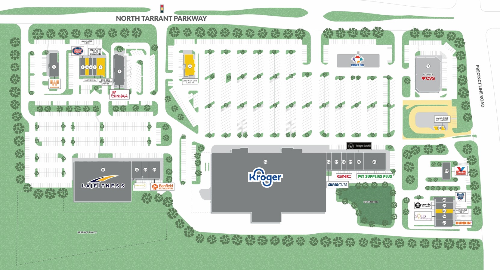 Un Kroger Marketplace de 123 000 pieds carrés est le point d'ancrage de ce nouveau développement qui offre 16 000 pieds carrés d'espace de vente en ligne et 8 sites de vente au détail. Parmi les nouveaux locataires figurent Chick-Fil-A, Wendy's, Whataburger, SuperCuts, Artisan Nail Spa et Chef Blythe's Southern Bistro. Le projet est situé sur N. Tarrant Pkwy et Precinct Line Rd. à N. Richland Hills, au Texas. N. Tarrant Marketplace s'est classée deuxième dans la liste des meilleures locations et ventes de détail de DFW établie par le magazine D en 2014.