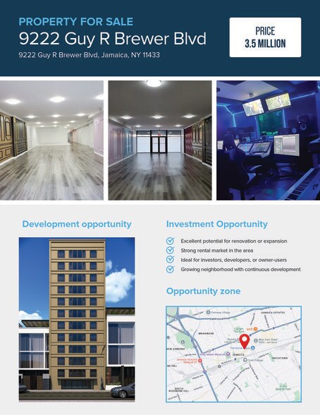 • 3 Bathrooms (2 GF, 1 Basement) Open layout | Great ceiling height Prime location on Guy R Brewer Blvd • Strong foot traffic day & night I Surrounded by new residential & mixed-use developments Basement ideal for storage or operations • Excellent visibility + heavy vehicular traffic