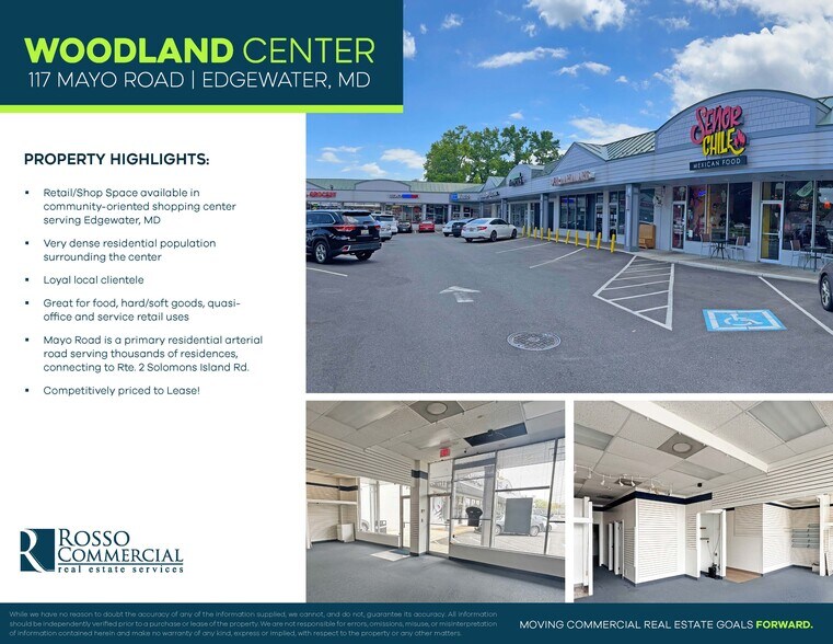 Coming available Nov. 1, this former music has occupied the center for many years. Newly Available In-Line Retail Space along Mayo Rd. Well appointed and highly sought after neighborhood strip center in Edgewater, MD available For Lease. Join Senors Chile, Londontowne Tropicals, and more... The neighborhood retail provides excellent visibility and signage with 20,000 cars passing daily. Contact broker for more details.
