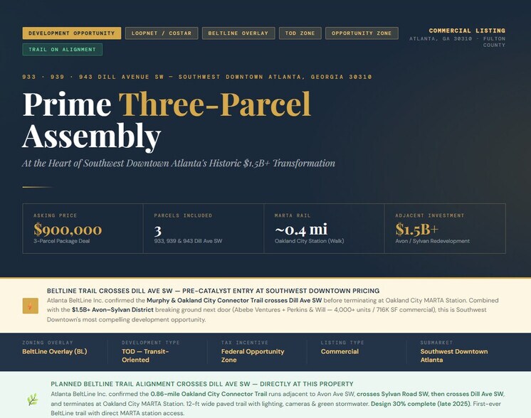 This three-parcel assembly at 933, 939, and 943 Dill Ave SW represents an exceptional entry point into the fastest-appreciating development corridor in Southwest Downtown Atlanta. Positioned within the Atlanta BeltLine Overlay District and adjacent to transformative public and private investment, this offering is ideal for developers seeking density entitlements with long-term upside and immediate market tailwinds.