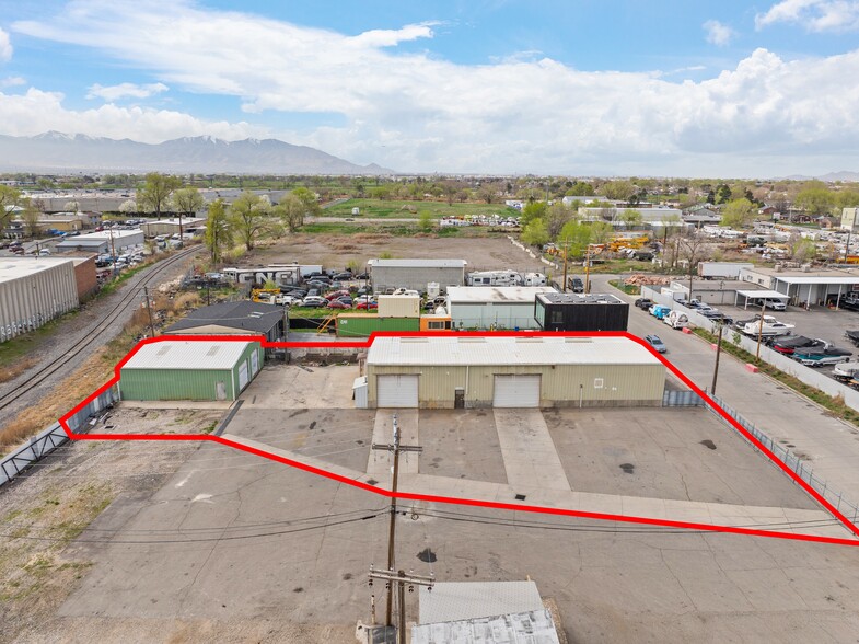 Two industrial warehouse buildings totaling 5,600 SF at 947 Quayle Ave in Salt Lake City. Both buildings feature 3 phase 240V power, multiple oversized overhead doors, and an overhead crane. Includes substantial outdoor yard for trailer, truck, and equipment storage with gated access off Quayle Ave. Tan building includes 470 SF of finished office space with 2 offices and 1 bathroom.