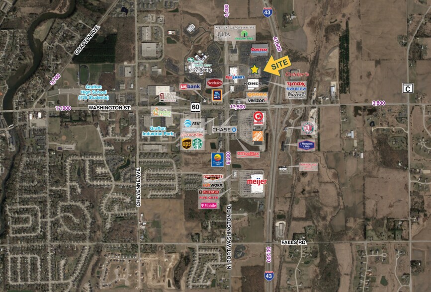 Grafton Commons est bien placée pour attirer les riches consommateurs de Milwaukee Northshore. Situé à l'échangeur I-43/Hwy 60, avec plus de 1 800 pieds de façade de l'I-43. Points d'accès multiples ; l'accès principal est signalé. Signalisation des monuments et des pylônes disponible. Les présentateurs incluent Costco, Kohl's, Dick's Sporting Goods, TJ Maxx, PetSmart et Michaels. 1 029 places de stationnement disponibles (4,4/1 000 pieds carrés) offrent un grand parking pour ce centre commercial de classe A.