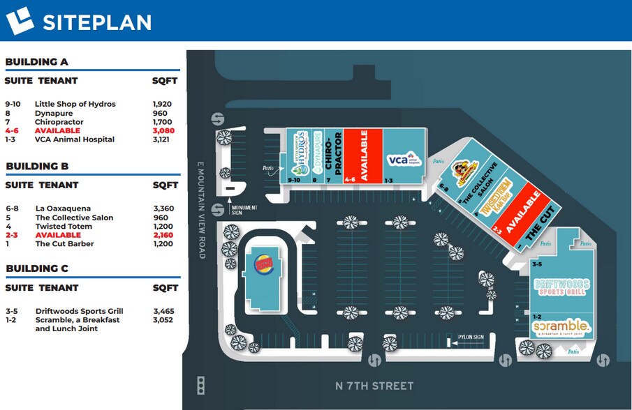 | Magasins | 10 | Rues transversales | NWC Mountain View & 7th St. |