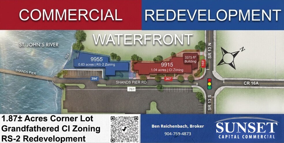 - Commercial Component: The 1.04-acre eastern parcel (9915) is under coveted CI Zoning and features a 3,703 SF building with 367 feet of frontage along Shands Pier Road.
