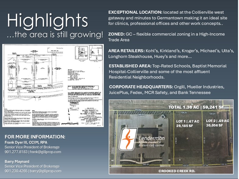 FOR SALE TWO PRIME COMMERCIAL LOTS 0 CROOKED CREEK ROAD, COLLIERVILLE, TN 38017 Don't miss this opportunity to acquire two prime commercial lots totaling 1.36± acres in one of Shelby County's most dynamic growth corridors! Located at the Collierville/Germantown border, these flexible zoned lots are perfect for clinics, professional offices, and other innovative concepts. The area boasts proximity to major retailers like Kohl's and Kroger, top-rated schools, Baptist Memorial Hospital-Collierville, and corporate headquarters such as Orgill and FedEx. Situated at a key gateway, these lots offer exceptional exposure and access, making them ideal for businesses looking to capitalize on the area's continued growth. With high-income demographics and over 25,000 daily traffic count on Poplar Avenue, this is a prime investment opportunity not to be missed. Reach out to us to unlock the full potential of these lots today. ASKING PRICE $360,000 | .69 AC $355,000 | .67 AC