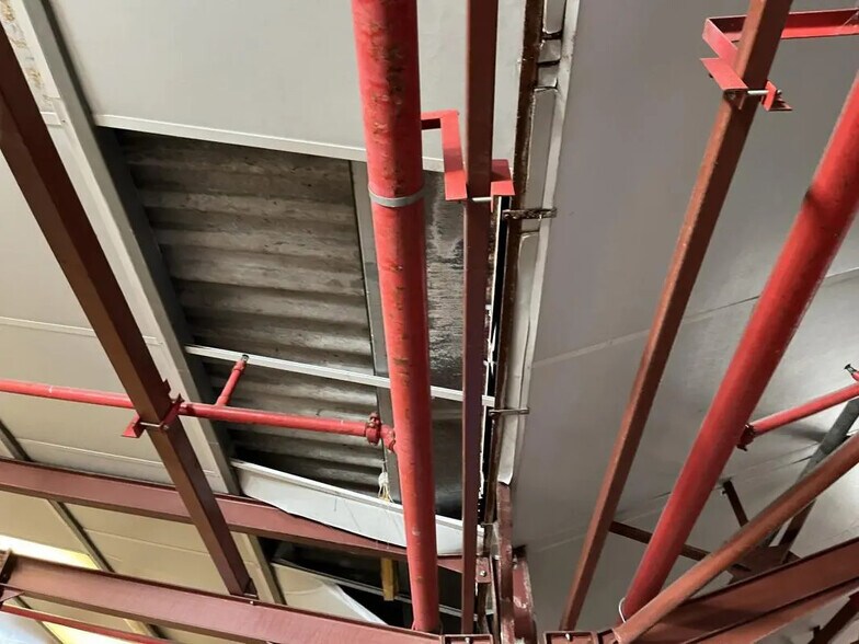 Bien que la toiture en fibrociment amianté, celle-ci ne nécessite aucune rénovation. Les parties communes, l'intérieur et à l'extérieur de l'entrepôt sont à rafraîchir,