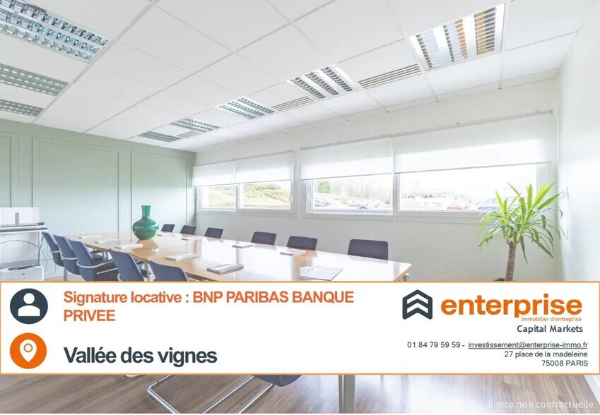 Enterprise Immobilier d'entreprise a le plaisir de vous présenter en exclusivité sur la vallée des vignes, un immeuble de bureaux d'une superficie de 750 m2 loué intégralement à un locataire AAA (BNP PARIBAS BANQUE PRIVEE) aux termes d'un bail commercial.