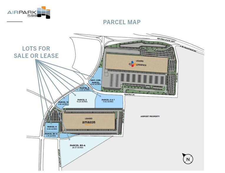 L'Airpark 599 est un parc logistique entièrement habilité et planifié sur 272 acres à côté de l'aéroport métropolitain de Stockton et de l'autoroute 99 à Stockton, en Californie. En tant que plaque tournante pour tous les principaux marchés du nord de la Californie, Airpark 599 ajoutera 3,47 millions de pieds carrés d'espace de classe A adapté au traitement des commandes électroniques, à la distribution ou à la fabrication de pointe, tout en améliorant l'infrastructure de la région et en créant de nouveaux emplois pour une main-d'œuvre nombreuse et qualifiée. L'emplacement centralisé de l'Airpark 599 répond aux besoins de transport idéaux grâce à la possibilité de se connecter aux autoroutes et aux autoroutes de la région (autoroute 99, I-5, I-205), aux installations intermodales ferroviaires situées à proximité (BNSF, Union Pacific), aux ports régionaux (port de Stockton, port d'Oakland) et au transport de fret aérien (aéroport métropolitain de Stockton).