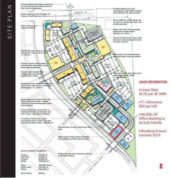 Vue d'ensemble de Riverstone - Une communauté planifiée pas comme les autres, Riverstone devrait établir une nouvelle norme de vie dans le centre de la Californie. Stratégiquement situé au cœur de la voie de croissance du métro de Fresno, dans le sud du comté de Madera, le projet de 2 000 acres bénéficie de plusieurs points d'accès aux principales voies de transport et offre un accès facile à un large éventail de zones de loisirs à Yosemite et dans les montagnes de la Sierra Nevada. Situé à proximité de l'autoroute 41 et de l'avenue 12, il offre une opportunité commerciale et de bureaux unique avec deux sites d'une superficie de 84 acres cultivables. Le complexe de Riverstone, composé de 900 unités résidentielles et s'agrandissant chaque jour, se trouve à environ 9,7 km du centre commercial Riverpark et à 4 km de l'hôpital pour enfants de Valley. Un revêtement de zonage flexible approuvé permettra d'utiliser le commerce de détail régional, le commerce de détail local et les bureaux. L'ensemble de la communauté est approuvé pour une utilisation commerciale de plus d'un million de pieds carrés. Situé à proximité de l'autoroute 41, de la porte d'entrée des Sierras et de l'avenue 12, Riverstone proposera 6 578 unités résidentielles, ainsi que des espaces commerciaux et à usage mixte, y compris des bureaux, des services et des commerces de détail. Un lycée et trois écoles primaires, ainsi que plus de 200 acres de parcs avec des réserves ouvertes, sont également prévus pour améliorer cette communauté où il fait bon vivre, travailler et jouer. Composant de bureau — 22 acres ou plus — Bureau de classe A 0,30 ± FAR = Jusqu'à 500 000 ± SF — Espace de bureau d'entreprise, siège régional, centre d'assistance/d'appels Composant de vente au détail — 22 acres ou plus — 0,22 ± FAR = Jusqu'à 500 000 ± SF — Commerce de détail sur Main Street, restaurants, marché fermier, fitness, divertissement, commerce de détail régional, commerce de détail grand format FONCTIONNALITÉS — Espace de bureau de classe A — Prêt à l'emploi — Espace de bureau d'entreprise, petit bureau, médical, etc. — Allocation T.I. négociable DÉTAILS Espace de bureau disponible : jusqu'à 500 000 ± pieds carrés Taux de location : 2,05$ PSF, NNN Zonage : commercial à usage mixte