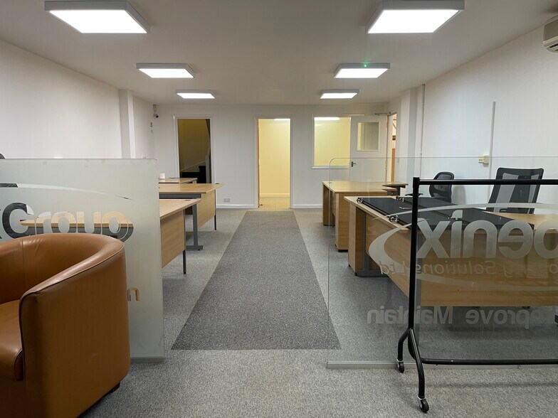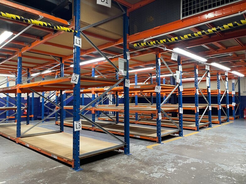 The property is a single-storey, steel-frame unit with north-light roofing, forming part of a terrace of four. It includes a production/warehouse area plus refurbished ground and first-floor offices. The warehouse has a minimum eaves height of around 4.2m and features a full-height loading door with added security, motion-sensitive LED lighting, emergency lighting, a 3-phase power supply, and separate male and female WCs. A large, two-level racking and storage system spans the full width and depth of the warehouse but can be adapted or removed to suit the incoming occupier. The office areas run along the side and rear of the building and benefit from air conditioning, gas central heating, LED lighting, a kitchenette, and additional WC facilities. The unit also has a dedicated loading/unloading area at the front and allocated parking for six vehicles. EPC rating: E (112).