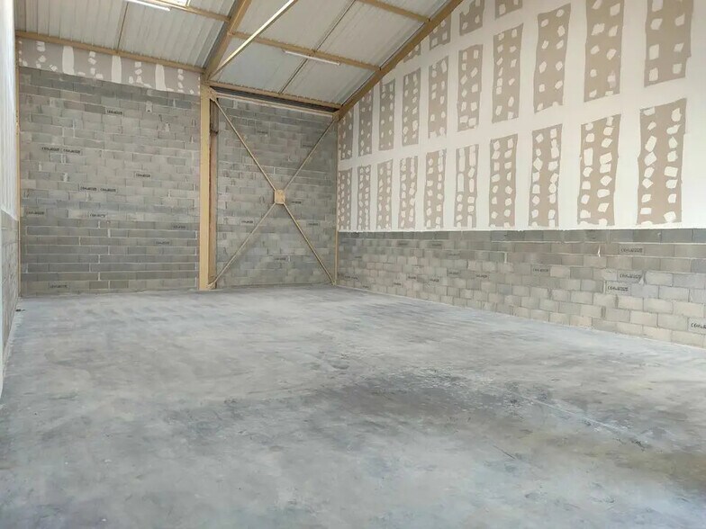 Dans l'atelier une dalle brute de béton. La porte sectionnelle est de 3 m x 3 m , la hauteur sous poutre dans l'atelier est de 7 m.