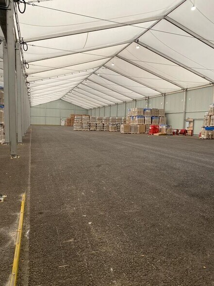 Le bâtiment d'entrepôt temporaire est une construction à ossature légère dans une configuration à double baie avec des portes de chargement à accès à deux niveaux. La structure offre une hauteur libre intérieure d'environ 6 mètres et une surface revêtue de tarmaca. À l'extérieur, jusqu'à 1,5 acre d'espace de jardin pourrait être mis à disposition si nécessaire. L'unité est située sur le centre de distribution de Severn, l'un des plus grands domaines unifamiliaux du sud-ouest. Le site est géré de manière à assurer une sécurité surveillée 24 heures sur 24, un fonctionnement 24 heures sur 24 est possible et un système de vidéosurveillance est installé à l'intérieur d'une clôture périmétrique sécurisée.