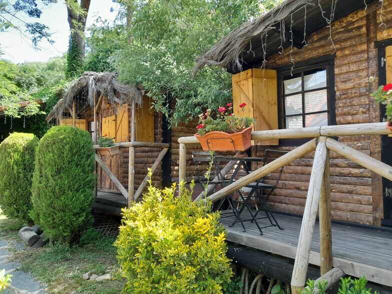 Dispone de dos bungalós de madera y ocho habitaciones dobles —algunas con baño privado y otras con baño compartido—, todas con acceso a una cocina común. Se suman otros dos bungalós con capacidad para tres y cinco personas. Además, cuenta con tres apartamentos con alojamiento para siete, cuatro y dos personas, casi todos con acabados en madera y excelente estado de conservación.
