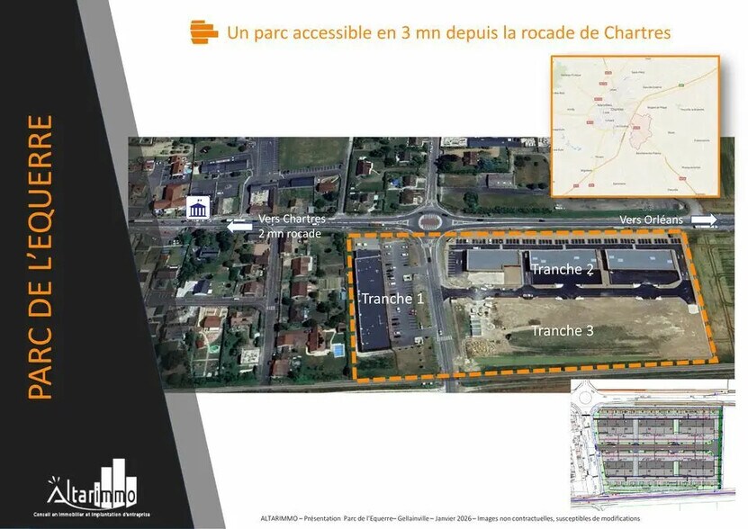 A LOUER LOCAUX D'ACTIVITÉS NEUFS au sein d'un parc qualitatif de locaux professionnels, destinés à des activités ARTISANALES, et de SERVICES. Les locaux sont divisibles sur-mesure, à partir de 253 m², dans un immeuble de plain pied. Le programme bénéficie d'une excellente visibilité, en façade de la RN154 (14 000 véhicules par jour), au sein d'un parc fonctionnel et à l'architecture originale. Opportunité rare sur l'agglomération chartraine. - Excellente ACCESSIBILITÉ & VISIBILITÉ en bordure de la RN 154 - Espace showroom bureau en façade - Atelier-entrepôt à l'arrière HSP 6 m - Cour privative à l'arrière de l'entrepôt - Parkings en façade pour les clients et usagers - Menuiseries aluminium à rupture de pont thermique - Structure : charpente béton, toiture bac acier prélaqué - Locaux aux normes RT2012. - Locaux livrés bruts. - Aménagements en option : - Aménagement de bureaux et sanitaires, création d'une mezzanine, chauffage de l'atelier/entrepôt.
