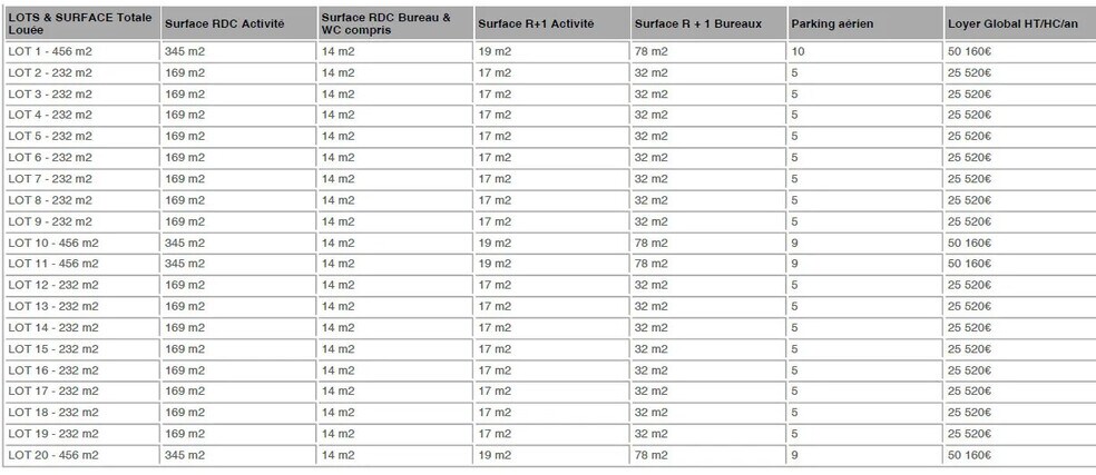 | 110,02 € HT-HC/m²/an 9,17 € HT-HC/m²/mois 25 525 € HT-HC/an 2 127 € HT-HC/mois |
