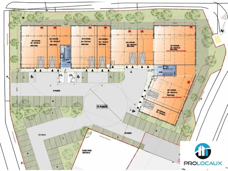Prestations - équipements : Locaux d'activité d'environ 1 795,56m2Les locaux d'activités sont livrés brut, fluides en attente5m de hauteur libreDimension de la porte sectionnelle :3m* 3m ht Dallage avec surcharge admissible au rez-de-chaussée : 1 000kg/m2Accès entrée et sortie pour véhicules légers et poids lourdsParkingPossibilité d'installer des bornes de recharge électrique