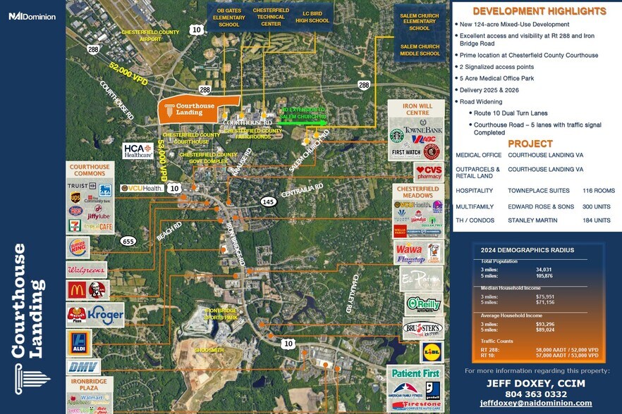 Courthouse Landing est un développement dynamique à usage mixte de 124 acres situé à l'intersection très fréquentée d'Iron Bridge Road (SR 10) et de Courthouse Road, dans le comté de Chesterfield. Avec un accès direct à la State Route 288 et un nombre impressionnant de 58 000 véhicules par jour (VPD) sur l'autoroute, auxquels s'ajoutent 57 000 VPD supplémentaires sur Iron Bridge Road, ce site offre une visibilité et une accessibilité inégalées.