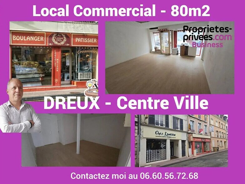 28100 DREUX- Local commercial 80 m²- Centre Ville. Local commercial de 80 m² sur 2 locaux, bien placé dans zone passante véhicules, piétons, commerces de ville. Yves ARCHAMBAUDIERE vous propose ce local ( ancienne boulangerie ) situé à 200 m de la grande rue piétonne, entouré de commerces, composé d'une salle en 2 pièces ouverte, large vitrine de 5 m avec entrée centrale, avec wc/lave mains séparé. Parquet au sol. Surface 40 m². Un autre local de 40 m² se situé séparément du 1er mais avec accès en partie arrière et avec accès commun. Idéal pour en faire des bureaux séparés du local principal avec fenêtres et porte entrée, parquet au sol ou bien de stockage matériel dans un lieu, au sec et chauffé. Wc séparé sur couloir. IDEAL: LOCAL ACTIVITE TYPE TERTIAIRE, ASSURANCE, MUTUELLE, AUTO ECOLE, SITE DE FORMATION . RESTAURATION REFUSEE TOUS TYPES. Loyer mensuel 1300 euros/sans TVA- annuel 15600 euros/sans TVA Taxe foncière charge preneur. ( provision de 1300 euros en étude calcul impôt ) Signature bail commercial notarié charge preneur. Pour visiter et vous accompagner dans votre projet contactez Yves ARCHAMBAUDIERE au [Coordonnées masquées] ou par courriel à [Coordonnées masquées] Cette présente annonce a été rédigée sous la responsabilité éditoriale de Yves ARCHAMBAUDIERE agissant sous le statut d'agent commercial immatriculé au RSAC CHARTRES 529 996 332 auprès de la SAS PROPRIETES PRIVEES, Réseau national immobilier, au capital de 40000 euros, 44 ALLÉE DES CINQ CONTINENTS - ZAC LE CHÊNE FERRÉ, 44120 VERTOU, RCS Nantes n° 487 624 777 00040, Carte professionnelle T et G n° CPI 4401 2016 000 010 388 CCI Nantes-Saint Nazaire. Garantie GALIAN - 89 rue de la Boétie, 75008 Paris Mandat réf : 435219 Référence annonce : 1300B-YAR honoraires négociation à la charge du preneur: 3000 euros Ht Yves ARCHAMBAUDIERE (EI) Agent Commercial - Numéro RSAC : CHARTRES 529 996 332 - . Référence annonce : 1300B-YAR Non soumis au DPE Honoraires : 3000 euros/Ht Dépôt de garantie : 2600 euros Yves ARCHAMBAUDIERE (EI) Agent Commercial - Numéro RSAC : CHARTRES 529 996 332 - .
