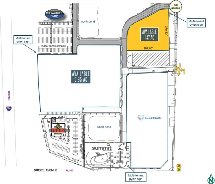 Un nouveau développement commercial offrant une grande visibilité et une accessibilité depuis et vers l'I-94. Situé à l'angle nord-est de l'I-94 et de l'avenue Drexel, ce complexe commercial de haut niveau sera développé en face du nouveau magasin IKEA. South 13th Street a été élargie à quatre voies. Deux parcelles de 1,47 acres et 5,95 acres sont disponibles. Il existe également un centre médical proposé. Les principaux employeurs de la région sont Northwestern Mutual, Amazon, Caterpillar Global Mining, PPG Industries et General Mitchell Intl. Aéroport, Reinhart Food Service et Master Lock (siège social de la société).