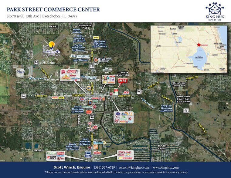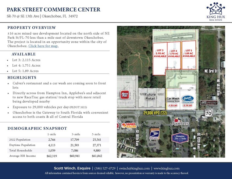 Located less than a mile from downtown Okeechobee, this 16+/- acre mixed-use development known as Park Street Commerce Center will consist of a Culver's Restaurant and an express car wash on the frontage. This site has been approved for a hotel by major brands such as Marriott, Hilton, and others. Directly across the street from the Hampton Inn, Applebee's and adjacent to the new RaceTrac with more retail being developed nearby. Exposure to 29,000 vehicles per day and located in an opportunity zone offering tax benefits, etc. This property qualifies to participate in the USDA Rural financing program as well. Seller to complete all sitework, including roadways, master storm system, etc. THE INFORMATION BEING PROVIDED HEREIN IS FOR INFORMATIONAL PURPOSES ONLY. NO REPRESENTATION OR WARRANTY IS MADE AS TO THE ACCURACY OR COMPLETENESS OF ANY INFORMATION CONTAINED HEREIN, INCLUDING WITHOUT LIMITATION, ANY INFORMATION REGARDING THE CONDITION OF THE PROPERTY, THE CONDITION OF TITLE, OR THE PROPERTY DESCRIPTIONS.