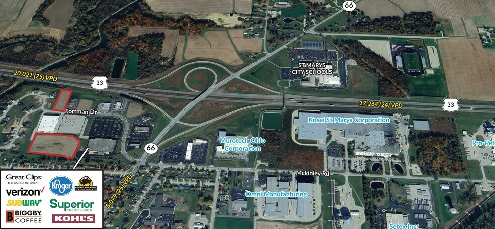 Des parcelles de 1 à 3 acres offrant une visibilité sur l'autoroute sont disponibles à la vente ou à la location dans le développement ancré de Kroger and Kohl. Situé dans une zone de réinvestissement communautaire de la ville de St. Marys offrant une exemption d'impôt foncier de 10 ans pour les nouvelles constructions. Emplacement idéal à l'intersection de l'US 33 et de la SR 66 à St. Marys, berceau de Grand Lake. Excellente visibilité et accès facile à l'US 33 et à la SR 66. Idéalement situé à moins de 16 km de Celina et de Wapakoneta. À l'intersection de l'US 33 et de la Sr 66 à St. Marys