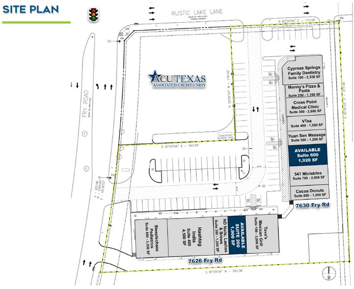 Situé à l'angle sud-ouest de Fry Rd et Rustic Lake Ln, entre la FM-529 et Longenbaugh Rd à Cypress, au Texas. La propriété se compose de deux immeubles commerciaux dont la façade donne sur Fry Rd.