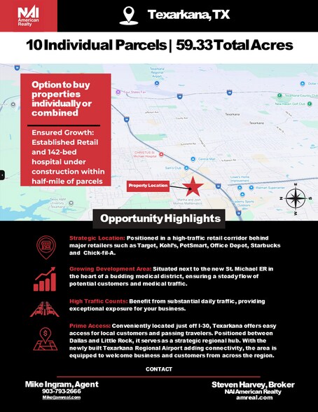 Unlock the potential of 10 individual land properties located along Gibson Lane, Pavilion Parkway, and McKnight Road in the thriving commercial hub of Texarkana, TX. These parcels are available individually or as a package, offering flexibility for investors and developers.