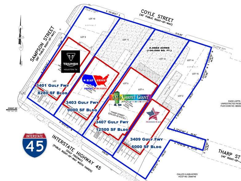 - The property site has multiple curb cuts with direct access from Gulf Freeway (Interstate Highway 45), Sampson Street, Coyle Street and Tharp Street
