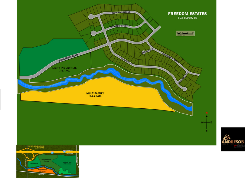 Le site est nivelé et prêt pour un développement multifamilial. Box Elder prévoit une croissance significative en raison de l'afflux continu de population dans les Black Hills. Services publics urbains et excellente visibilité sur l'I-90 et à proximité de l'entrée principale de la base aérienne d'Ellsworth. Juste à côté du boulevard Liberty, où l'on assiste à une expansion significative du nombre de maisons unifamiliales et à une croissance commerciale en prévision de l'expansion de l'AFB. La propriété peut être achetée individuellement ou dans l'ensemble du terrain. Publié par Kevin Andreson Keller Williams Black Hills 605-646-5409