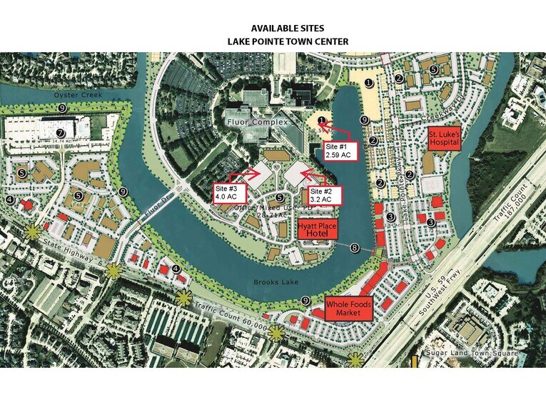 The property is bordered by Brooks Lake, offering attractive water views and the potential for premium site design. Regional access is unmatched, with immediate frontage along US-59, which carries roughly 180,000 vehicles per day, and direct proximity to State Highway 6. The parcel benefits from existing high-density residential clusters, strong daytime employment drivers, and well-developed internal roadways already connecting the district.
