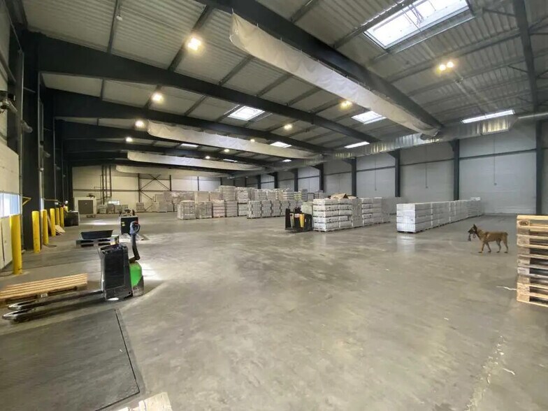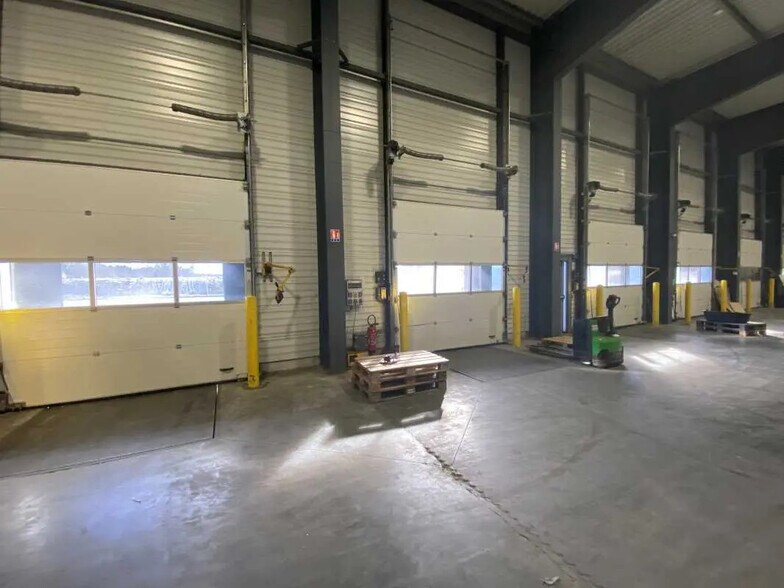 Isolation double peau, trappe de désenfumage, 6 quais niveleurs 3x3m, 1 porte sectionnelle plain pied 4.5 x 4.5m. Dalle béton quartz. Hauteur entre 6.25 - 7.6m, système de température régulée. 380 v triphasé.