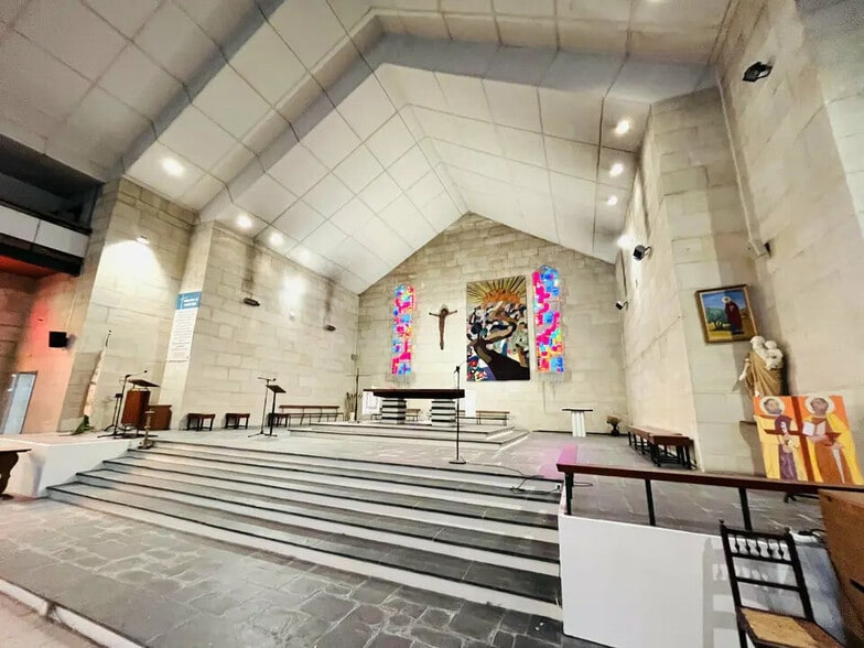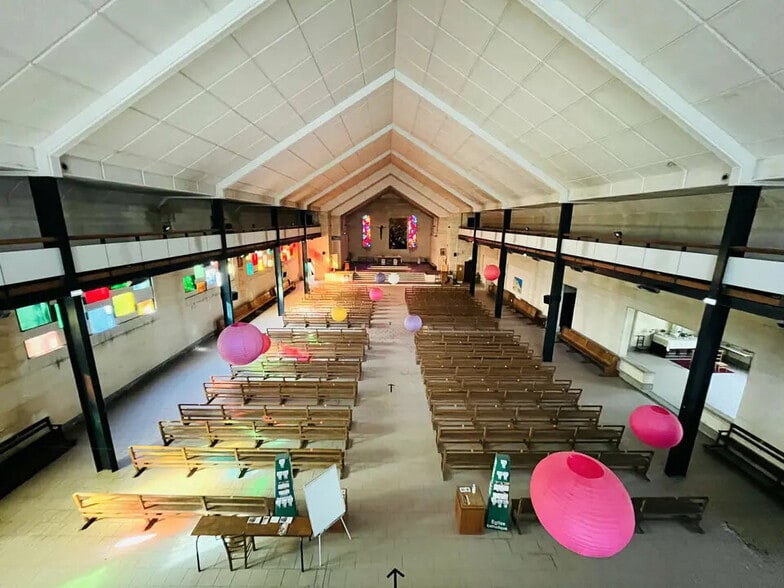 Le Bâtiment offre une superficie au sol d'environ 1430 m2 comprenant un grand Hall, une Nef centrale hauteur au faitage 12,00 ml d'environ 700 m2 à laquelle viennent s'adosser 4 chapelles proposant une hauteur sous FP de 3,25 ml, la sacristie, bureaux, sanitaires et enfin le Choeur plateforme surélevé de 6 marches d'environ 110 m2. Au dessus de la nef centrale, des coursives sont aménagées en hauteur soutenues par piliers métalliques permettant d'accéder à une grande mezzanine d'une superficie d'environ 138 m2 dominant la Nef centrale. 5 accès existants de plain pied dont 1 PMR.