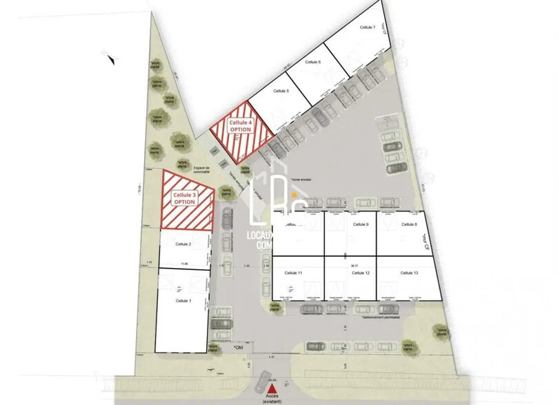 Il comprend 2 portes sectionnelles traversantes dont une de 4mx3,5m, une porte piéton avec baie fixe de 2,2mx2m, une zone de stockage extérieur privatif d'environ 51 m², ainsi que 2 stationnements privatifs.
