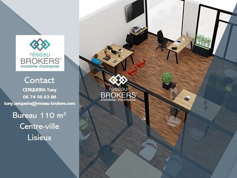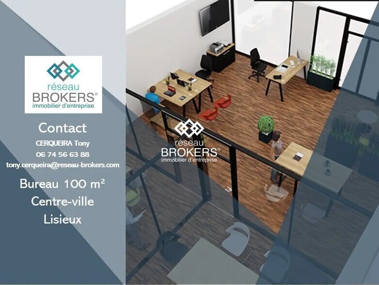 Bureaux Spacieux à Lisieux Nous vous proposons à la location un ensemble de bureaux idéalement situés à Lisieux, Rue Achard. Ces bureaux offrent une superficie totale de 270 m² répartis sur trois niveaux : - *Premier niveau* : 100 m² - *Deuxième niveau* : 110 m² - *Troisième niveau* : 67 m² Ces espaces de travail lumineuse et fonctionnelle sont parfaites pour accueillir vos équipes dans un environnement professionnel et agréable. *Loyer annuel : 55 200 € HT HC* - *Charges annuelles* : 9 600 € - *Taxe foncière* : 8 400 € N'hésitez pas à nous contacter pour de plus amples informations ou pour organiser une visite. RESEAU BROKERS® est le premier cabinet immobilier d'entreprise structuré en réseau de mandataires. Nous maillons avec notre équipe de 80 Brokers une grande partie du territoire national pour accompagner nos entreprises clientes dans leurs recherches de commerces, bureaux, locaux d'activités, immeubles et fonciers. www.reseau-brokers.com Non soumis au DPE. Les informations sur les risques auxquels ce bien est exposé sont disponibles sur le site Géorisques : georisques.gouv.fr. Ce bien vous est proposé par un agent commercial (Entreprise individuelle). Votre conseiller AVINIM RESEAU BROKERS : Tony CERQUEIRA Agent commercial (Entreprise individuelle) RSAC 430.317.602 RCP 10770730104