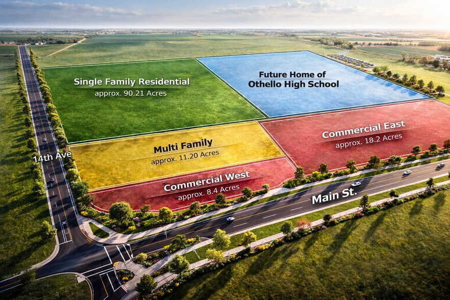 This newly planned development area in Othello is strategically located at the intersection of Main Street and 14th Avenue, just off Highway 17 and directly across from Walmart. Positioned in one of the city’s most visible and accessible corridors, the site is set to become a dynamic new growth center for the community. Future plans include a vibrant mix of commercial development, a new high school campus, thoughtfully designed residential neighborhoods, multifamily housing, and assisted living facilities—creating a well-balanced, walkable district that will serve Othello’s expanding population for years to come. Othello, Washington is a growing rural community in the heart of Adams County, surrounded by some of the most productive farmland in the Pacific Northwest. Known for its strong agricultural roots, Othello serves as a regional hub for farming, food processing, and agricultural innovation. The area produces a wide variety of crops, including potatoes, onions, corn, and other specialty produce that supply markets across the country. Conveniently located along State Route 26 and within easy reach of Interstate 90, Othello offers direct access to Spokane, the Tri-Cities, and Moses Lake. Its strategic location supports both commercial activity and residential growth while maintaining a small-town atmosphere. Downtown Othello features local shops, restaurants, and community services, creating a welcoming environment for residents and visitors alike. The city is also known for its strong sense of community, highlighted by annual events such as the Sandhill Crane Festival, which celebrates the region’s unique wildlife and draws visitors from across the Northwest. Outdoor recreation is a major draw, with nearby Potholes State Park, the Columbia National Wildlife Refuge, and numerous lakes and trails offering year-round activities including boating, fishing, hiking, and birdwatching. With its affordable land, expanding infrastructure, and steady economic base, Othello continues to attract families, agricultural businesses, and new development opportunities while preserving its agricultural heritage and close-knit community character.