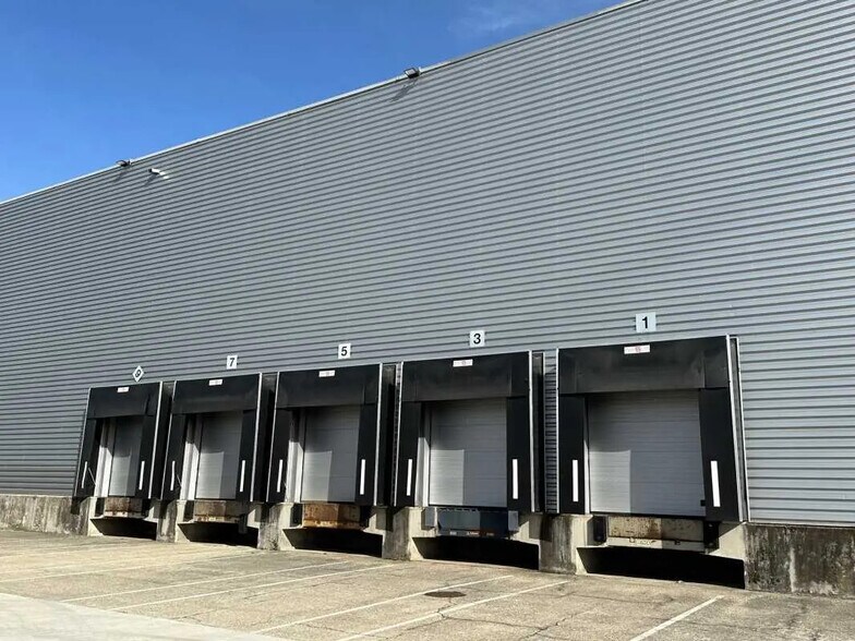 Le bâtiment est un vaste entrepôt logistique contemporain, reconnaissable à sa façade en bardage métallique gris clair qui lui confère une apparence industrielle moderne. La structure est dotée d’une longue rangée de portes à quai équipées de sas de chargement, alignées de manière homogène sur toute la longueur du bâtiment. Ces quais permettent l’accueil simultané de nombreux poids lourds pour les opérations de chargement et de déchargement, ce qui témoigne d’une activité logistique soutenue. Devant le bâtiment, une large aire de manœuvre bitumée offre un espace dégagé permettant aux camions de circuler, de reculer et de se positionner en toute sécurité. Les marquages au sol indiquent des zones de stationnement ou de guidage, renforçant l’organisation du site. L’ensemble apparaît propre, fonctionnel et conçu pour optimiser les flux logistiques. Le ciel dégagé et les abords bien entretenus suggèrent un site opérationnel, adapté aux activités de distribution, de stockage ou de transport de marchandises.