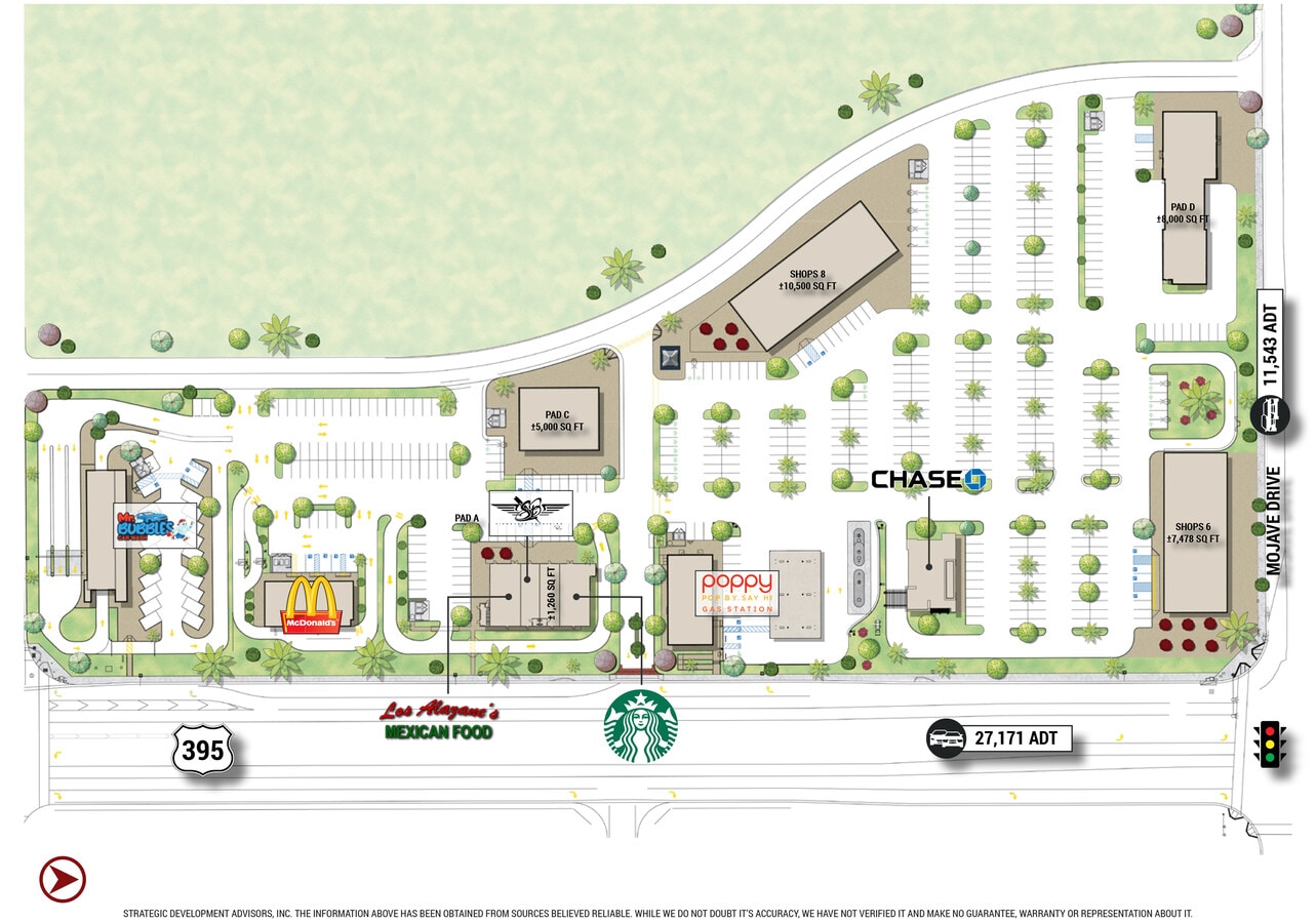 10,500 sf of retail space Ideally located at the major signalized intersection of Highway 395 and Mojave Drive with irreplaceable frontage of over 120 ft along Highway 395 with exposure to over +38,000 CPD