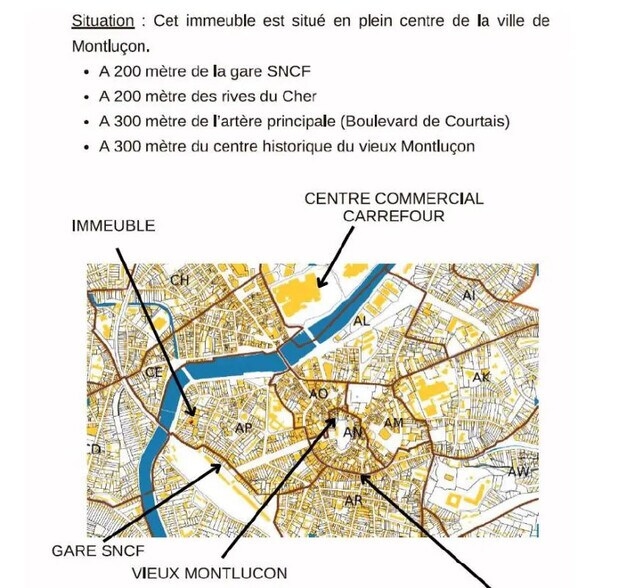 Immeuble indépendant à ancien usage industriel d'environ 3 400 m², composé de deux grands plateaux organisés autour d'un patio central. Terrain attenant d'environ 300 m² inclus (parcelles cadastrales 679, 680 et 681). 15 rue Hector Berlioz – 03100 Montluçon Toiture refaite. Travaux de rénovation intérieure à prévoir, adaptables au projet du preneur. EMPLACEMENT - Plein centre-ville de Montluçon - À 200 m de la gare SNCF - À proximité immédiate des rives du Cher - À 300 m du boulevard de Courtais et du centre historique ATOUTS - Immeuble indépendant - Volumes libres, grande modularité - Accès multiples - Fort potentiel de requalification urbaine USAGES POSSIBLES (selon réglementation) Halle gourmande – Self-stockage urbain – Logistique urbaine – Activités artisanales ou tertiaires – Loisirs indoor / événementiel CONDITIONS - Loyer : 32 € HT / m² / an - Terrain inclus - Bail commercial ou professionnel Libre – dossier complet et visites sur demande.