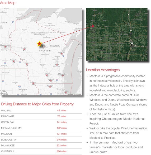 The property benefits from adjacency to a thriving retail corridor anchored by Walmart and Maurices, serving communities within a 35-mile radius. Traffic counts on nearby highways range from 9,121 to 10,475 vehicles per day, ensuring strong visibility and accessibility. Medford is a regional hub for industrial and manufacturing sectors and is home to major employers such as Hurd Windows and Doors and Nestlé Pizza Company.