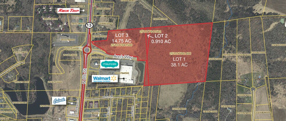 This 53.76-acre development opportunity consists of three parcels located along N. 8th Street and Ann’s Way in Medford, Wisconsin. Positioned within TID #13 and zoned C-1 Commercial, the site offers flexibility for a variety of uses including retail, food service, office, and potential residential or multi-family development.