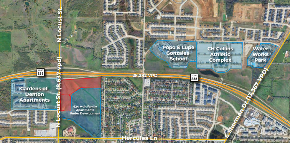 N Locust Street & Loop 288 Tracts (Denton) offer a premier commercial development opportunity on the southeast corner of N. Locust Street (FM 2164) and N Loop 288. The site totals +/- 16.885 AC and is available as two individual tracts (+/- 12.56 and +/- 4.33) or as a single purchase. Zoned SC, the property is well-suited for retail, office, or restaurant development and benefits from strong surrounding growth—over 4,000+ multifamily units and thousands of existing and planned homes within a 2-mile radius. With direct Loop 288 frontage and quick access to I-35 (3 minutes) and Hwy 380 (5 minutes), the site provides excellent visibility and connectivity. Additionally, the developer benefits from all utilities, all detention, border roads, mass grading, and a traffic signal at Beall Street provided at no cost, creating a highly competitive and shovel-ready offering.
