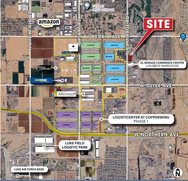 The surrounding trade area continues to grow at a robust pace, supported by strong household incomes, expanding daytime employment, and major logistics and warehouse facilities. Nearby developments such as the El Mirage Commerce Center and Logisticenter at Copperwing reinforce the area’s position as an emerging industrial hub with long-term upward momentum. Traffic volumes exceeding 20,000 to 38,000 vehicles per day along key intersections amplify the site’s visibility and long-term commercial value.