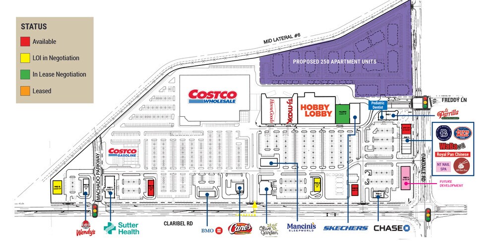 COSTCO est maintenant ouvert à Crossroads West à Riverbank, en Californie Nous louons actuellement des ancres et des supports dans un nouveau développement de 365 000 pieds carrés Livraison prévue pour le printemps 2025 -Rejoignez Costco, Wendy's, Raising Cane's et Chase Bank -Zone commerciale régionale desservant Riverbank, NE Modesto, Oakdale et Escalon pour les besoins quotidiens, les détaillants régionaux et les restaurants -Un tout nouveau centre commercial à usage mixte offrant des possibilités d'ancrage, de service au volant et de plateforme -Capture une population de 372 000 habitants et 121 500 ménages en 15 minutes de route -Adapté aux piétons et à distance de marche de plusieurs nouveaux ensembles résidentiels de grande envergure -Stratégiquement situé à l'intersection de deux artères principales (Claribel Rd — 25 553 ADT et Oakdale Rd — 19 136 ADT)