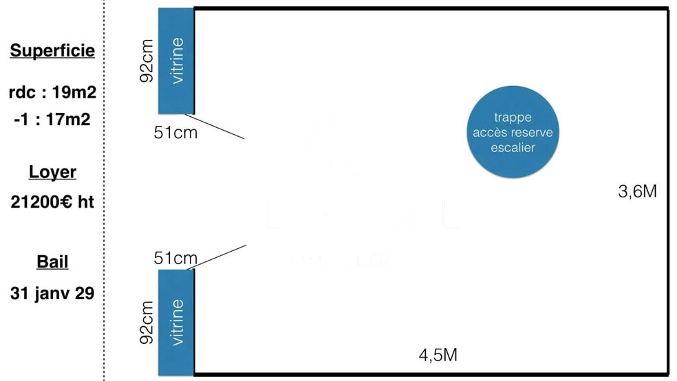 Paris 4e Marais Situé dans une petite rue très prisée du Marais, entourée de grandes enseignes internationales, ce local bénéficie d'un emplacement premium à très forte visibilité. Claire C'Commerce vous propose un local commercial de 19 m2, complété par une réserve de 17 m2 accessible directement depuis la boutique, offrant une surface fonctionnelle et optimisée pour l'exploitation. La façade se compose d'une porte centrale encadrée de deux vitrines d'environ 1 mètre chacune, garantissant une excellente exposition commerciale. Bail en cours durée restante : 3 ansDestination du bail : équipement du foyer La localisation est exceptionnelle, au coeur d'un des secteurs les plus recherchés du Marais, parfaitement adapté à une enseigne qualitative, un concept store, une marque lifestyle ou un point de vente premium.