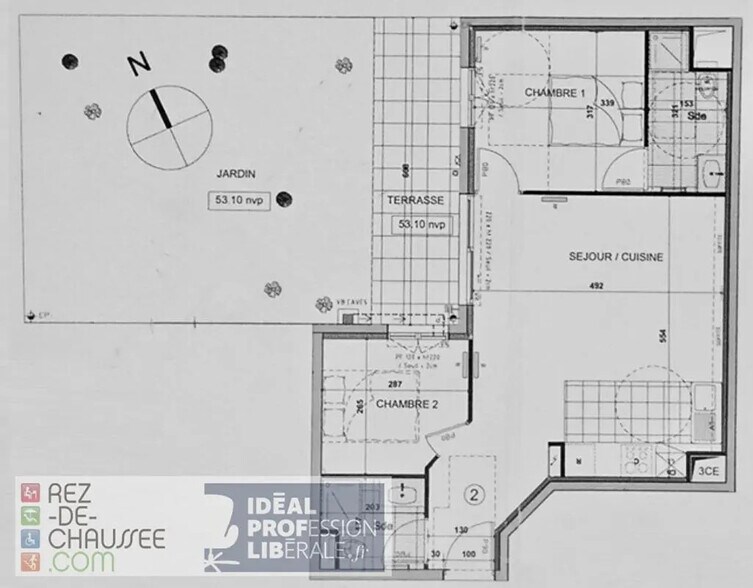 IDÉAL PROFESSION LIBÉRALE. ESPACE AVEC TERRASSE ET JARDIN. Dans une copropriété très récente, nous vous proposons un espace en REZ-DE-JARDIN de 55,16m2 Carrez permettant d'installer 2 à 3 postes de travail. Divers points d'eau. Deux sanitaires. La terrasse et son jardin occupent une surface de de 54m2. Une cave en RDC complète ce bien. DPE C. Copropriété de 17 lots d'habitation. 3,83% TTC d'honoraires d'agence à la charge de l'acquéreur. Contact : REZ-DE-CHAUSSEE.COM au 06 79 80 52 89. Responsabilité éditoriale: Michel VALENTINO (EI), agent commercial de REZ-DE-CHAUSSEE.COM immatriculé au RSAC de PARIS sous le numéro 851 452 516. (3.83 % honoraires TTC à la charge de l'acquéreur.) Copropriété de 30 lots - dont 17 lots habitation. Les informations sur les risques auxquels ce bien est exposé sont disponibles sur le site Géorisques : www. georisques. gouv. fr