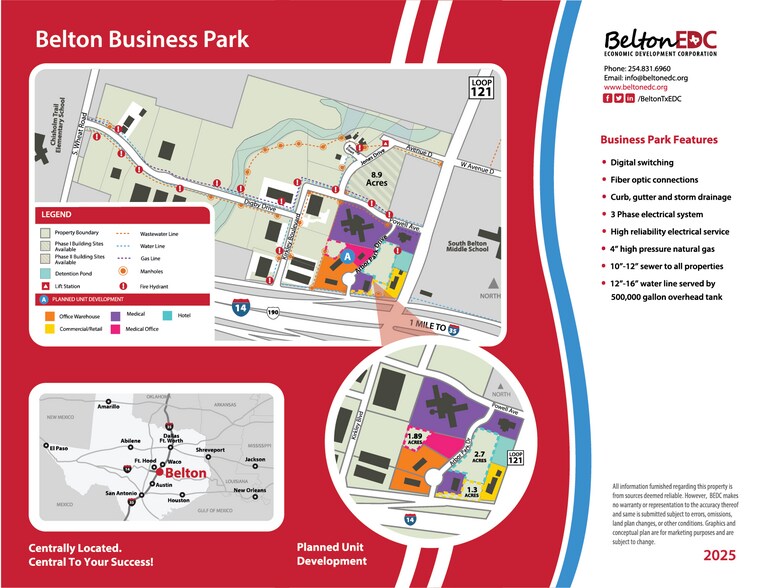 - Excellent emplacement dans le parc d'affaires de Belton, à proximité de l'IH-14, à 1,6 km de l'IH-35.