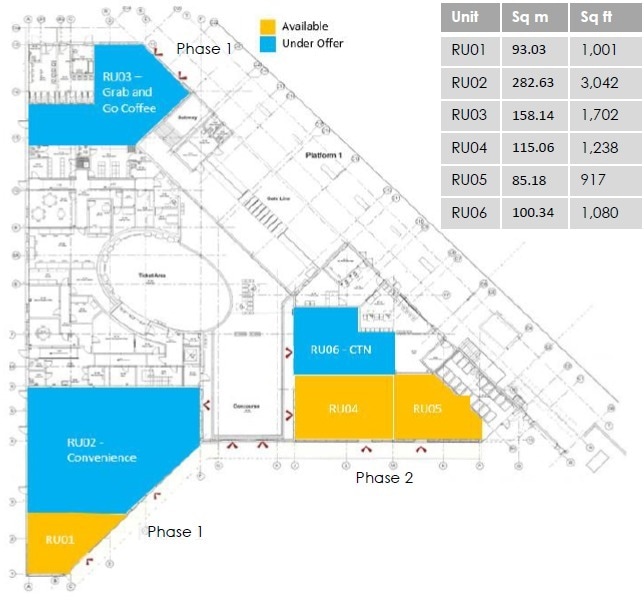 Les locaux comprennent une importante unité commerciale située à l'avant de la gare. La surface intérieure nette est la suivante : - Rez-de-chaussée : 84,75 m² (912 pieds carrés)