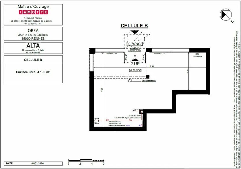 LAMOTTE ENTREPRISES & COMMERCES vous propose, au rez-de-chaussée de la résidence Oréa (rue Louis Guilloux, à proximité du Mail et du centre de Rennes) un local commercial / professionnel d'environ 47 m². Une place de stationnement en sous-sol. Locaux livrés brut de béton, vitrines posées, réseaux et fluides en attente Prix de vente : 100 590.00 Euros HT, stationnements en sus Prix unitaire stationnement : 12 000.00 Euros HT Un second local (surface similaire) est également disponible. Ref : FG-35_0106