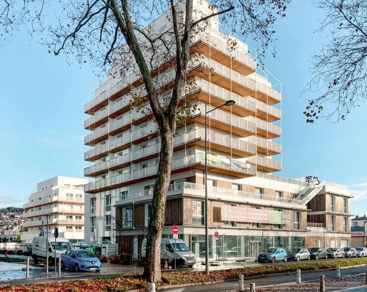 Les trois premiers niveaux, destinés aux commerces et bureaux, forment un piédestal à une résidence de standing,